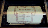 Piano rolls for the Welte-Mignon T98 system, made since 1924, are mostly called "Welte green" rolls because their paper was mostly conspicuously green. The red or wine-red piano roll card boxes display on the front side a label with the name Welte-Mignon, the roll number, the title and information on the pianist. The same label is found on the piano roll - the label is turned on its head when the roll is inserted because the roll unwinds from bottom to top. Some rolls include the production date. A few rolls are only marked with typewriter labels. A round eye at the beginning serves insertion into the take-up reel. This roll format corresponds in size to the 88 note standard format. Welte green piano rolls can be acquired as recently punched copies.
