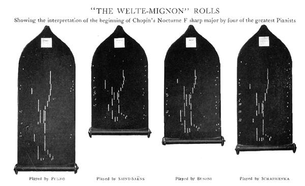 Recorded piano rolls were made by recording the original play of a pianist at special recording grands and by post processing these. Most of these rolls were provided with a copy of the pianist's signature to document that this roll contained the play of this pianist. Hupfeld called these rolls künstlernotenrollen, or artist's piano rolls. Welte published only recorded rolls. Aeolian labeled them "hand played". In whatever way the recording was realized - a good quality provided - the decisive feature of any roll was the high-quality post processing, including the cooperation of the pianist/composer. Post processing therefore produced some rolls of really good results. According to my experience, almost any roll of Hupfeld DEA and Triphonola is of very high quality, while Welte may either have fantastic rolls or rather mediocre conversion quality. The subjective impression, though, is the prime motivation for any joy of music.