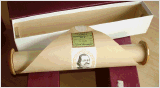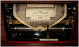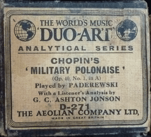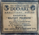 Duo-Art rolls of the Aeolian Company are based on the 88 note standard format and have, in addition, the punchings necessary for reproduction. The Duo-Art Piano rolls, hence, can be played back on conventional 88 note standard pianolas - just cover four holes in the bass and descant sections, because these are intended for the accentuation control. The Duo-Art rolls have at the beginning a striking Duo-Art decoration on thicker paper, roll number, title and performer are named in the middle. Some rolls also carry the photo of the pianist a little further above the beginning. The signature of the pianist is often found on the card box in addition to this label, as is in most cases a price tag. The sides are made from black bakelite, like those of the 88 note piano rolls. A round eye at the beginning serves for hanging into the take-up reel. A great number of original Duo-Art rolls is well preserved in America and England - and also as recently punched copies.