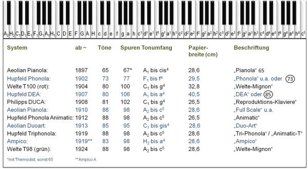 Like in pianola typology, piano rolls differ by use, because they were adapted to the type and scale of the pianola and thus often specifically designed by each manufacturer.