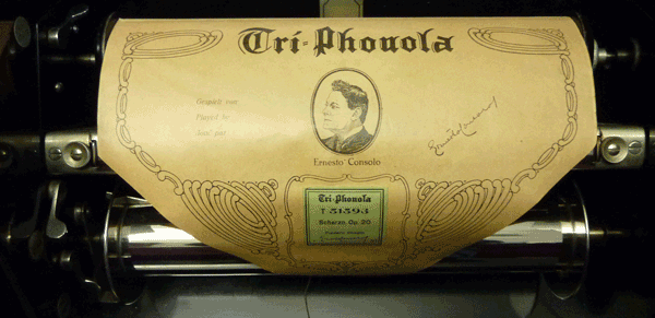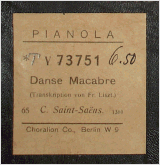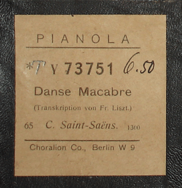 The Phonola piano rolls with the 72 note scale were sold since 1902, first only as marked-up rolls and after 1905 also as recorded artist's rolls. These artist's rolls feature mostly roll numbers higher than 12,000, often also the signature as well as sometimes a photo of the playing artist. The paper has a "Phonola" watermark and the production date at the back of the beginning. Hupfeld Phonola rolls have wooden flanks and metal spikes on both sides for insertion into the piano roll box. These rolls are attached onto the lower reel and unwind upwards, therefore the roll label is accordingly arranged.