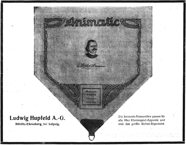 The Hupfeld piano rolls with the 88 note scale were introduced in 1912 and labeled with the registered trade mark "Animatic". These piano rolls do not only address all the 88 tones but also contain control information for the sustain pedal and accentuation (Solodant). The cardboards of Hupfeld Animatic piano rolls are mostly green - the beginnings are often also made of green paper. Recorded Animatic rolls are labeled "Künstlerrolle", most often including the name and now and then a photo of the artist.