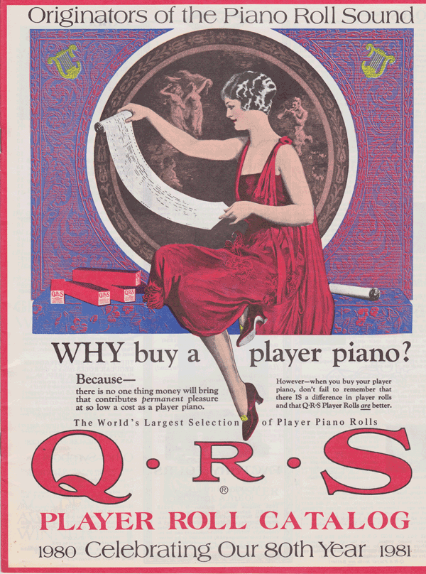 QRS began making piano rolls in 1900. This brand is especially worth mentioning, because this is the only company that still exists and offers piano rolls - even though since early 2000 they seem to dwell mainly on their stock. According to them, 1927 was the year of record roll sales: 10 million items! The name QRS was supposedly derived from „Quality Real Service“ - another version says this name originated in the alphabetical mailboxes "Q", "R", "S" that this company used internally. Today, the QRS rolls are recognizable by their red cardboards with the remarkable logo. The rolls are simple but solid and reliably running. The huge repertoire, including titles up to modern pop music, is very interesting. Special editions like the "Christmas rolls", annually released since the early 20th century (green Christmas cardboards) and the artist's rolls "Celebrity Rolls" (golden cardboards) and other offers are worth mentioning here. These rolls can be ordered directly from QRS in the USA, besides the second-hand market.
