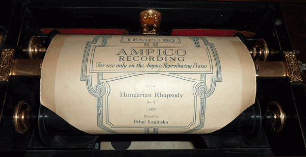 The Ampico rolls are also based on the 88 note standard format and have, in addition, the punchings necessary for reproduction. The Ampico rolls feature at the beginning a greenish decoration on normal thin, brownish paper that is standard for Ampico, a large statement on the tempo is found in the middle (most other roll types have this printed close to the beginning of the punchings), below is the note "Ampico Recording - For use only on the Ampico Reproducing Piano", the roll number, title and performer. The card boxes are mostly black, the label is at the cardboard front end. The sides of the piano rolls are made of black or brown bakelite like the 88 note piano rolls. A round eye at the beginning serves for hanging into the take-up reel. A great number of original Ampico rolls is well preserved in America and England - and also as recently punched copies.