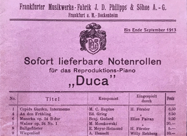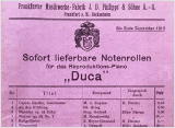 In 1912 Philipps formulated this motto: "Was uns unsterbliche Künstler in ihrem Spiele geboten, ruft uns heute das DUCA in seiner vollen Schönheit zurück.", saying "What immortal artists have given us with their play, is brought back to us in all its beauty by the DUCA. " And a little further down in the text it says ". . .this instrument is the best what was brought up to now in the area of the reproducing instruments. . . ". This statement is, from our point of view, absolutely justified with regard to the technical realisation (instruments and rolls) - even though some marketing is in this statement.