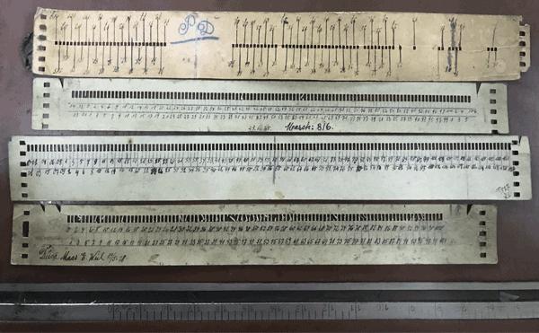 Within the collection of the preserved DUCA production parts many of these scales were found. They had obviously been used in the production process among other things for DUCA. These scales are from thicker cardboard with cuts for a gearwheel guidance (original gearwheel is also preserved) on both sides. Hypothesis is that the mother's rolls were made out of the same material.