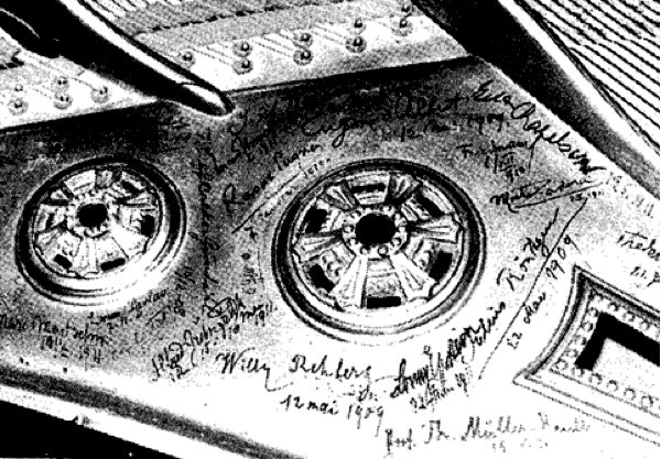 H. W. Schmitz has, years ago, found the Lipp recording grand piano (ser no 26087, photo from DMM 040). Unfortunately, the recording unit had already been removed decades before. Nevertheless, many signatures of the pianists who had recorded on this piano had been preserved. We compared these dates with the dates noted in the DUCA roll book. Most data correspond precisely to the recording dates in the DUCA book. Some are a few days before or after the recording session. We assume that the pianists had mostly spend several days in Frankfurt and have supported also the pre / postprocessing of the roll recordings.