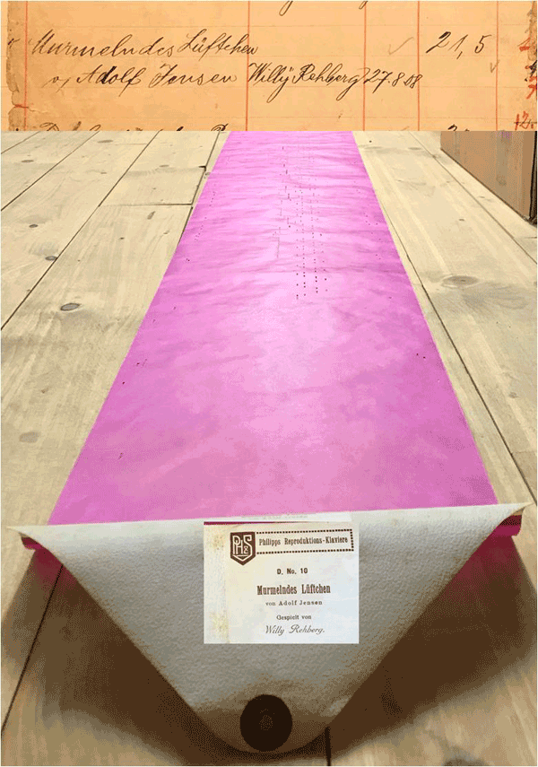 It is remarkable that the roll lengths given in the DUCA book (in metre) is different from the lengths of the DUCA play rolls. It is actually twice the lengths of the playable DUCA rolls. The photo shows the DUCA roll No 10 "Murmelndes Lüftchen". Roll length in the catalogue: 21.5 m. Actual roll length of the punched area of the playable DUCA roll: 10.75 m. As experts already supposed, the recorded rolls had twice the lenght to allow a more precise recording. In the transfer of mother roll to playable roll the length gets halved.