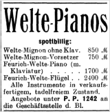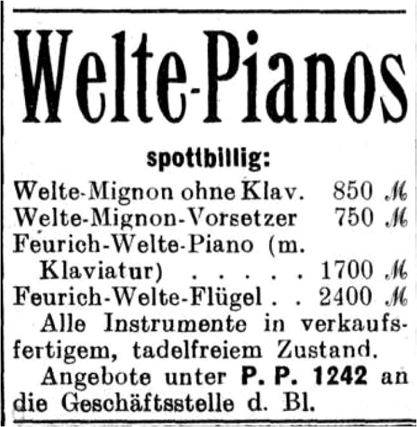 We have read thru ca 60% of the Feurich documents. Some books are not accessible as they first have to be restored to be read / scanned. Nevertheless just now we have collected incredible details on the Feurich production being delivered to become a reproducing piano, i.e. Welte Mignon, Duca, Ducartist, Tri-Phonola, Stella, Dea, ...! Just with the appr. 60% of the data, impressive numbers show up: more than 1000 instruments for Welte delivered (655 cabinet, 270 Welte Pianos, 80 Welte grand pianos), more than 270 Duca instruments (10 cabinet, 215 Pianos, 55 grand pianos). These numbers will increase significantly, once we had a chance to see all the books. As we do not have the sales books of Welte or Philipps, we can't doublecheck if all these became instruments for sale. However we expect that nearly all of them did, as huge investments went into these. More details to come.