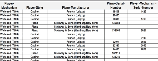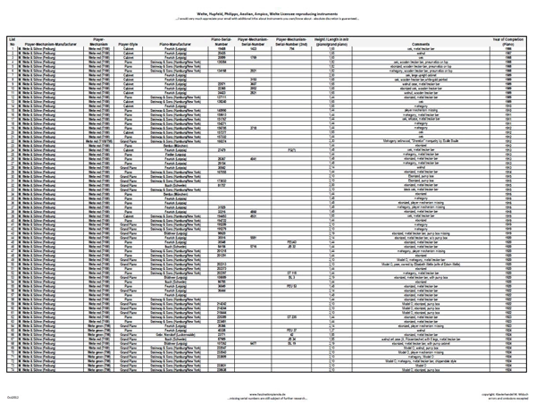 We started a research to compile a list with all existent instruments [Welte-Mignon red, Welte-Mignon green, Hupfeld Phonola, Hupfeld-Clavitist, Hupfeld-Phonoliszt, Hupfeld-DEA und Hupfeld-Duo/Tri-Phonola, Aeolian DUO-ART (combined with Steinway), Philipps DUCA/Pianella as well as Ampico A, Ampico B and Welte Licensee Instrumente]. You will find the most recent issue of that list here [339 KB]