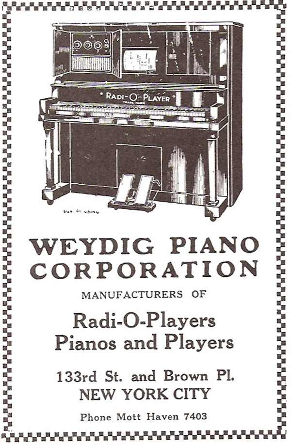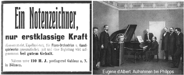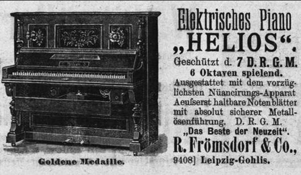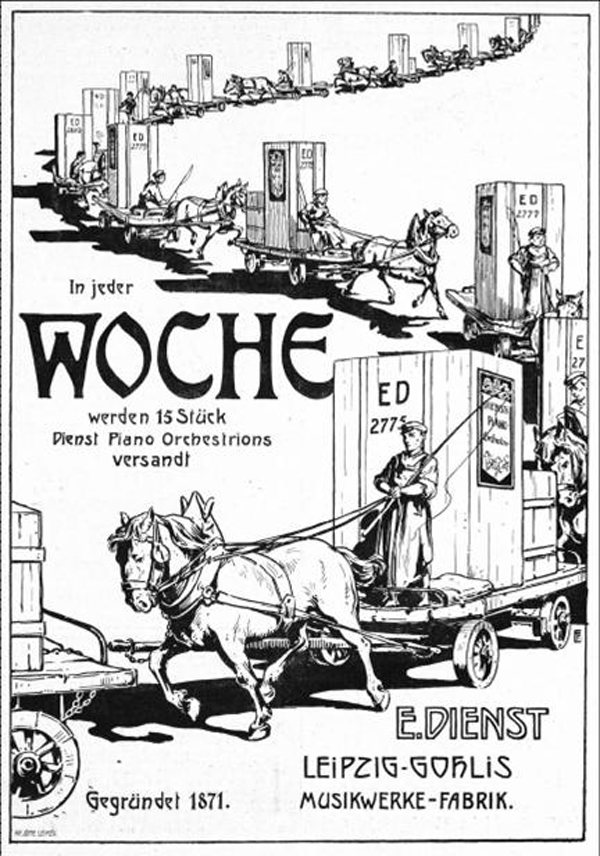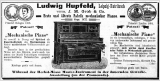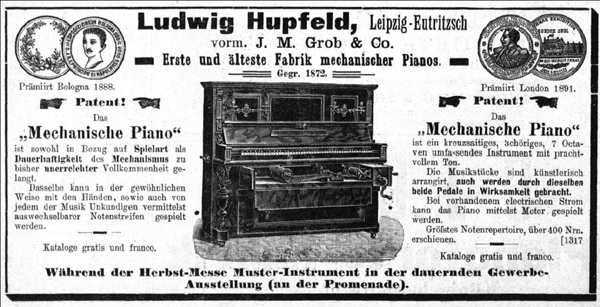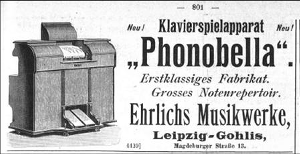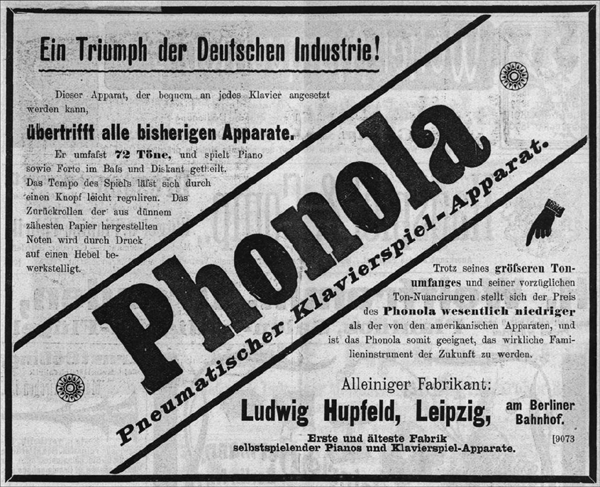 Although there were different self-playing piano mechanisms much earlier, in the 19th century, e. g. in France, Germany and the USA, the certainly decisive breakthrough of the pianola was achieved by the American Aeolian Company - and by Hupfeld in Germany shortly after, with the Phonola. Hupfeld utilized the possibilities of advertisement and contemporary media extensively, placing advertisements of the Phonola that would straightly target the Pianola consistently and at the most prominent places, not only in the "Zeitschrift für Instrumentenbau".