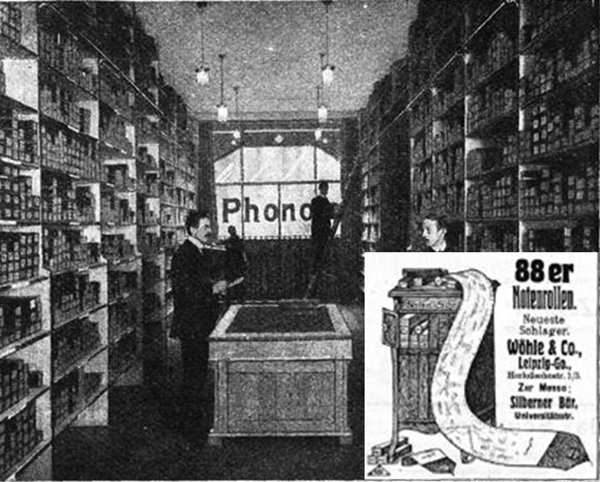 The piano traders found a rewarding follow-up trade in the continuous sale of piano rolls. The most recent titles were promoted: current tunes, marches, pop songs and new recordings of the most popular classical titles. An average collection of a pianola owner included approx. 50-70 titles. Not only the manufacturers of the pianolas focused on this interesting business, but other companies did, too. Piano rolls were even available in libraries for a lending fee. Not only new titles were acquired but also replacements for piano rolls that had been so often played that they could not be reliably used any more.
