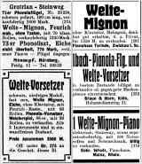 Of course the prices were influenced by many factors during the difficult market situation (WWI, economic crisis, currency fluctuations/inflation, competition of many manufacturers ...) of the late 1910s and the 1920s. In reality, prices could deviate from those stated in the price-lists. Even good and cheap second-hand instruments with an interesting piano roll repertoire became increasingly available, as suggested by the announcement from the Zeitschrift für Instrumentenbau, 1929, shown below.