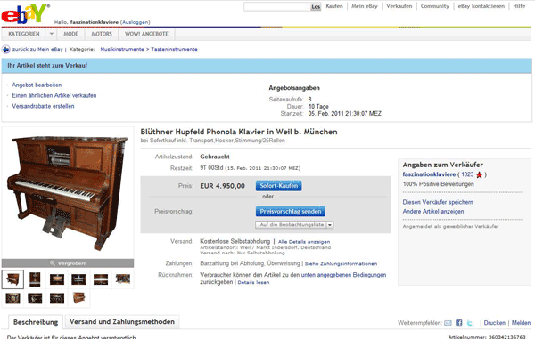 Price in 1910 of a Buff-Hedinger Feurich pianola grand: more than 3,400 Mark