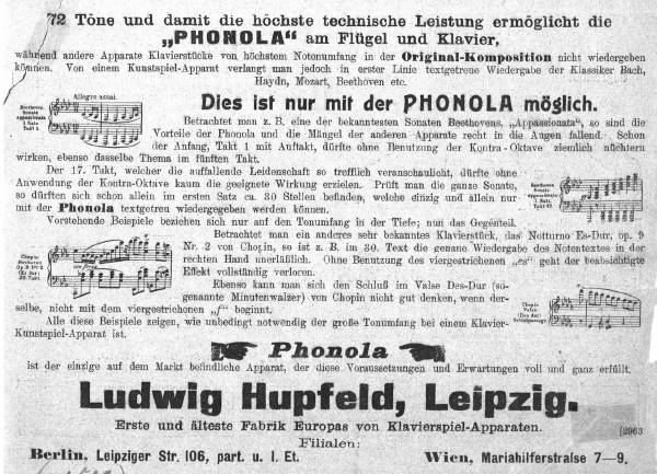 The subject of the broader sound range to reproduce pieces in the original score was advertised by the companies - here an example of Hupfeld - as an important characteristic.