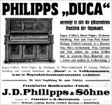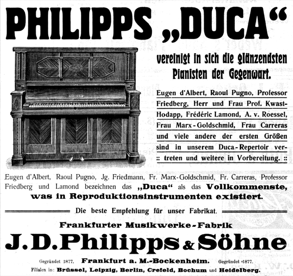 Phillips AG in Frankfurt launched the DUCA reproduction system in 1908. The importance of unique performance features in contrast to the main competitors is demonstrated by the fact that the DUCA reproduction system was promoted as having the widest range of all, 81 tones (Welte had 80 then). This system used also its native roll format - the narrowest of all reproduction systems, reasoning that these narrow piano rolls were better protected against expansion in humid conditions. This has actually proven to be right, looking at the a hundred years old rolls. Like Welte and Hupfeld, they tried to hire great names for the repertoire of piano rolls – and succeeded in doing so - so a very nice repertoire grew esp. up to 1913. Technically, though, the DUCA system is absolutely high-quality and plays very well if it is faithfully restored.