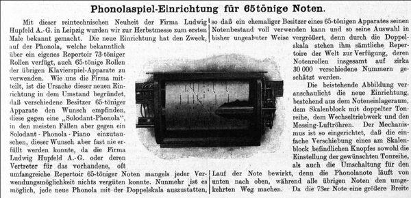 Hupfeld launched the 72 note scale in 1902 to surpass their main competitor Aeolian with a broader range and a divided wind chest (separate dynamism of bass and descant). Many experts, books, articles etc. stated that Hupfeld had a mistake in their Phonola advertising - as the Phonola played 73 notes instead of 72. The truth is that Hupfeld announced the 72 notes on purpose - as this was the intended standard. The notes ranged from F1-f4 - but without F#1. Many Hupfeld Phonola had the F#1 as "extra" note (makes 73 notes) on whole 39. We assume that Hupfeld gave 72 notes to the Hupfeld Phonola by default to allow the Phonola related Clavitist, Phonoliszt, Universal etc. to make use of max. 5 wholes on the tracker bar (77 wholes had all of them) to control the additional functionalities. Esp. the Phonoliszt made use of these. For sure there are Hupfeld instruments out there that deviate from this standard. Nevertheless "72er Hupfeld Phonola" would be the correct / intended denomination. After 1907, the Phonola is also available as a version that is integrated into pianos.