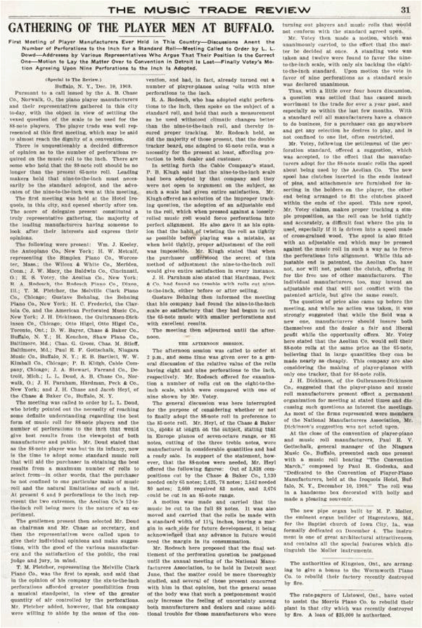 A much cited analysis of Chase & Baker, 1908 which assessed 3838 piano rolls from their own catalogue showed that much less pieces could be converted 1:1 from sheets to rolls when the scale of 65 tones was used. Out of those 3838 piano rolls, 1130 (29 %) could be played with the 65 note scale. 2425 (63 %) of the piano rolls needed at least a range of 78 tones, 2542 (66 %) of them required 80 tones, 2660 (69 %) required at least 83 tones, 3676 (96 %) required at least 85 tones and all rolls could be played with the range of 88 tones, of course. Reductions and octavo shifts were carried out to keep the 65 tone interval so that pieces could be projected down onto the 65 note scale. The Chase & Bakers analysis understandably influenced the decision for one 65 note standard and one 88 note standard scale. Although this standardization was established in America and only by the leading American companies, the European manufacturers also began one by one to adopt the allegedly modern 88 note standard.