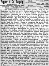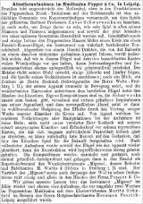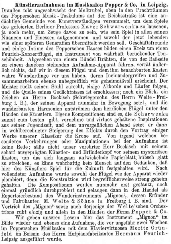 This article (Zeitschrift für Instrumentenbau, Sep 1904) describes the first public presentation of the Popper "Artist" at Pre-Easter fair in Leipzig. As creator M. Welte & Soehne (Freiburg) has been named. No doubt, this is the early Mignon, still with the Popper owned product name "Artist". Noteworthy, Popper & Co also got the rights on the product name "Mignon" on April 9th, 1904. Same for the product name "Welte-Mignon" on April 28th, 1906.