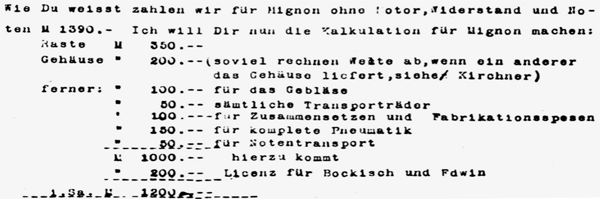 Another astonishing detail in the Welte history is this calculation by Hugo Popper (focused on the Feurich Welte cabinet). This is again taken from the Hugo Popper letter to Hermann Moehle in 1906 (source: copy of the letter by W. Baus, original owned by Hanns Popper). These letters had been written by Hugo Popper, when being highly annoyed by M. Welte & Soehne and their announcement of a price increase.