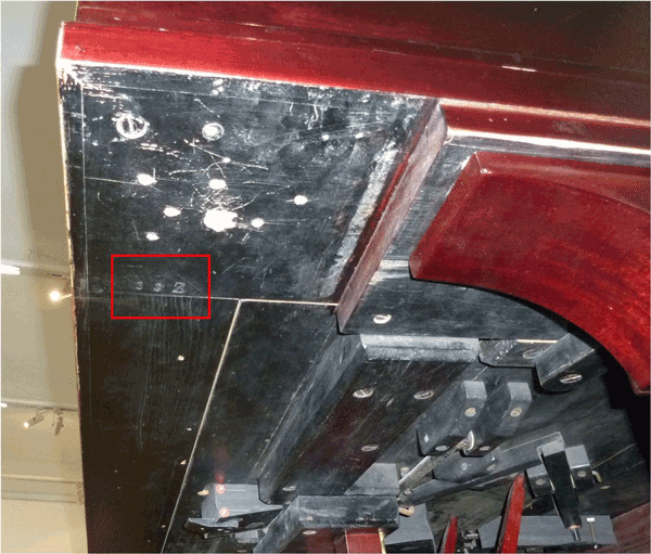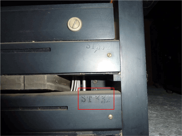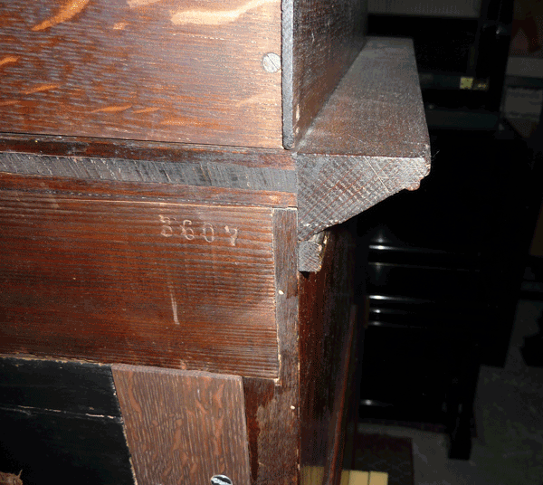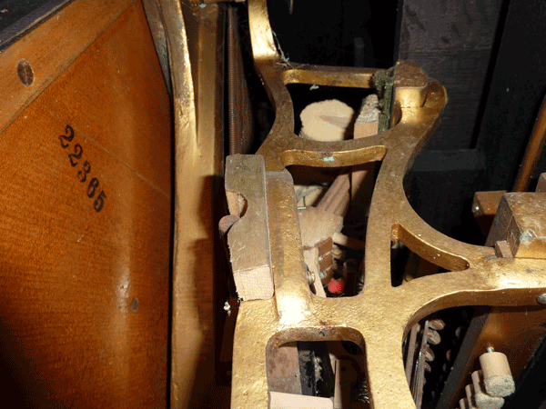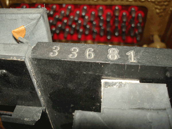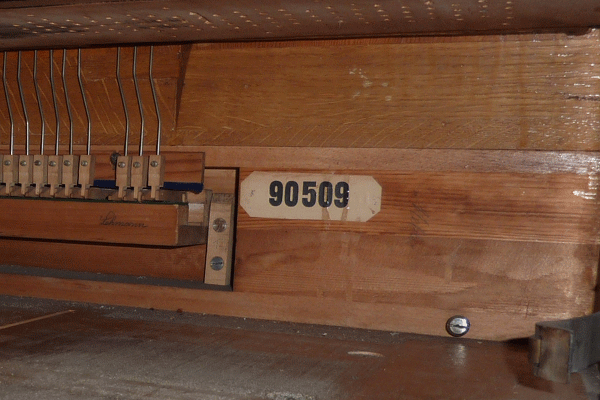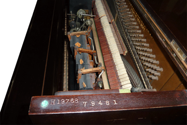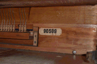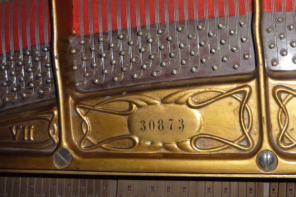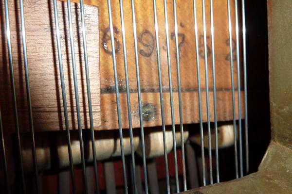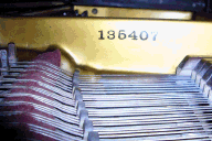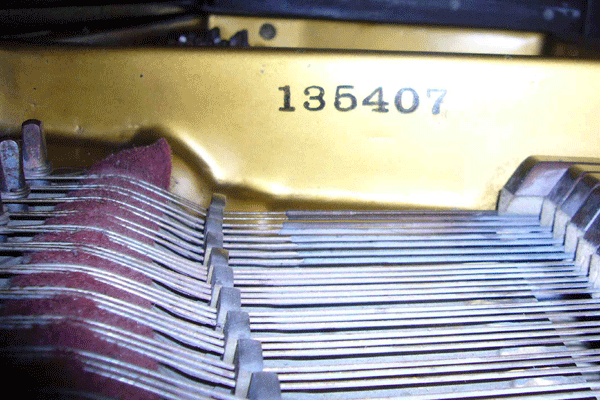 Some examples of serial numbers found in the instrument follow. The serial number is sometimes deeply hidden or was scraped off during a previous overhaul. In that case, you may determine the age of the piano by checking the serial number of the action as well. The only other way is to check the design or other details.