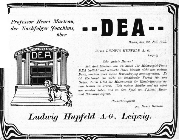 Hupfeld's Phonola catalog from 1908 contains several pages of listed customers to whom instruments were delivered - see the series of images below. Otherwise, Hupfeld advertized rather by quoting customers - as for example for the DEA system. The popularity of Hupfeld's DEA and, later, the Triphonola systems was probably much lower than that of the Welte red and green systems.