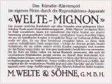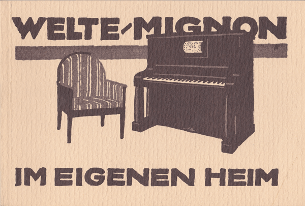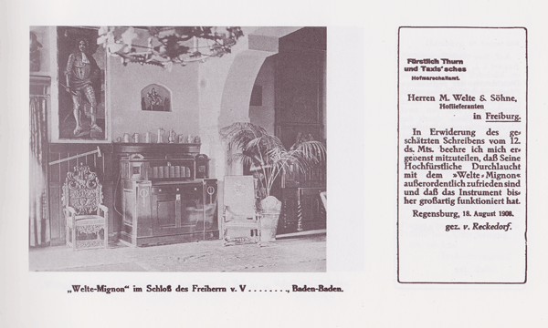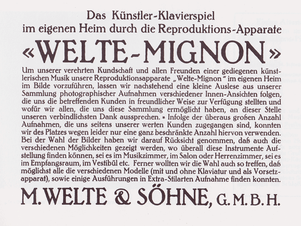 M. Welte & Söhne GmbH, Freiburg, published a small catalog about 1914 that featured on 25 pages photos of Welte instruments in the rooms of famous customers. The instruments are seen in different styles appropriate for the respective parlor, music room, study, reception room, the vestibule etc. Also, quotes of the artists and owners praising the Welte system are listed there.