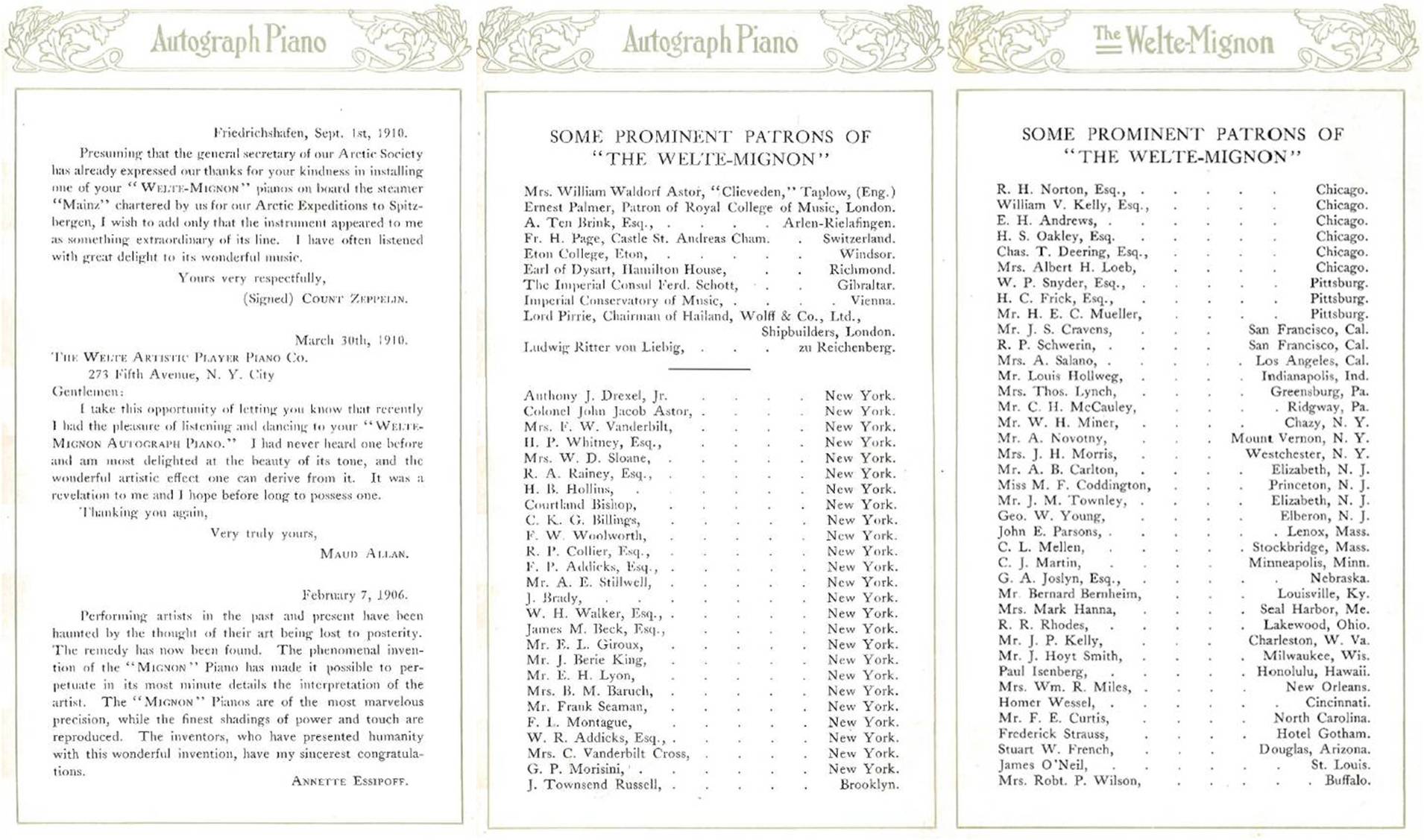 After Welte systems were also available in America - and later licensed and sold -, the number of famous customers who owned this system and are sometimes mentioned in the accompanying list increased there as well, of course. A part of the piano rolls available for the German Welte system was also available for the Licensee Version, the references of the German Welte red system were also used for advertisement there - especially with regard to the numerous royal families and great industrialists named.