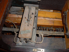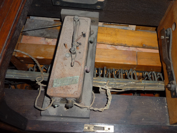 A safety note here: there is mercury in ancient artistic and reproducing instruments. At that time, electrical switches were made applying little mercury tubs and a retractable metal handle or a mandrel. The danger of mercury vapors, that may occur in significant quantities even at room temperature, was not yet known then. In any case, check whether the pianola has open mercury switches (there may also be closed mercury dip-switches) and whether they are still containing any mercury. This mercury needs to be removed - or the container should be tightly secured. Do this especially before transporting the instrument or tilting it (or placing it on its side, in the case of a grand piano). This work should only be accomplished by a professional hand.