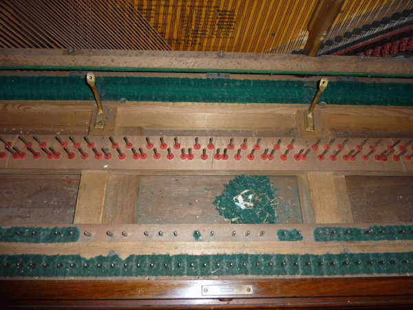 If you acquire an older used pianola, consider cleaning by an expert piano-maker even before setting it up in your living space, because loads of decade-old dust and dirt may have accumulated in the more hidden parts. Here you see an example of rather normal dirt below the keyboard incl. a desolate mouse nest, which is not that uncommon.