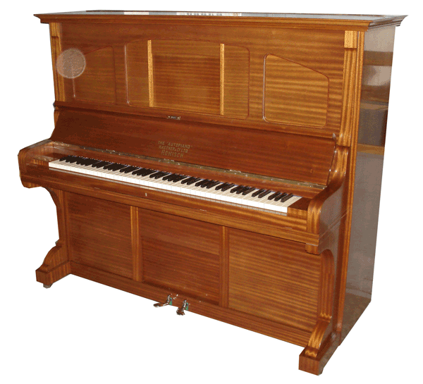 Intending to revive the familiar original Rönisch sound, only the necessary parts of the piano were restored - for example the bass stringing - all other original parts were carefully refurbished, especially the original hammer felts. The pianola was also extensively overhauled by a specialist, all air-conducting bellows were covered anew, valves replaced where necessary and the whole system was cleaned, released and regulated. Besides, the missing pedal function was complemented by the installation of a suitable relay and a suction turbine was provided for automatic operation. After refurbishing, the piano impressed anyone present by the beauty of its sound beyond expectations. This piano really deserves the name concert piano. The self-playing equipment runs wonderfully, and by the additional installation of the suction turbine, the pedal function, a controlled air feed and shutdown it is very comfortable in use, without losing the charm of the real pianola. As examples of the challenges in authentic renovation I would like to mention that even a replacement for the rare and totally corroded original hinges of the folding under which the operating levers for the pianola are found was discovered and installed. Also the sound-proof box for the suction turbine was designed in mahogany and was provided with the garnish moldings of the piano, so that visual harmony was achieved. Now it can be played as a pedal-operated pianola, as a normal piano and also as an automatic self-playing piano. The wide variety of 88 note piano rolls permits almost unlimited listening in addition to active playing.