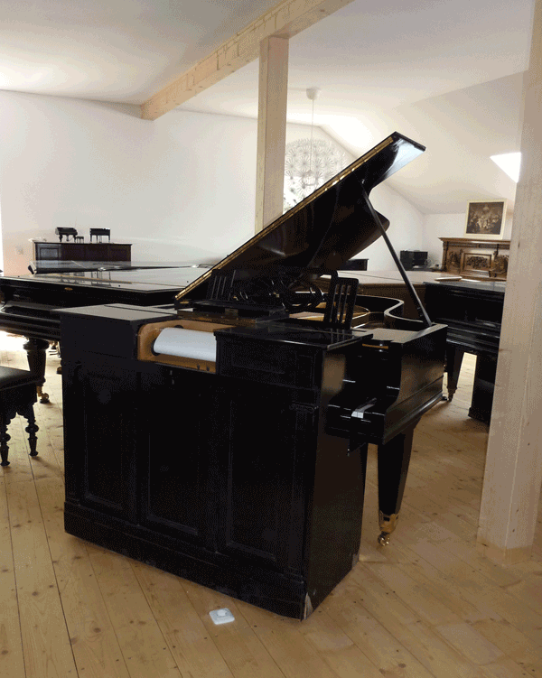 As a result, the push-up player plays again at the highest level at different pianos and grand pianos. Knowing the fine regulation possibilities allows to adjust the push-up player to different instruments. Key weight, response of sustain and soft pedals and sound and dynamic behavior have to be considered. Considering the huge repertoire of used and new piano rolls, Welte-Mignon push-up players offer a unique music experience.
