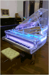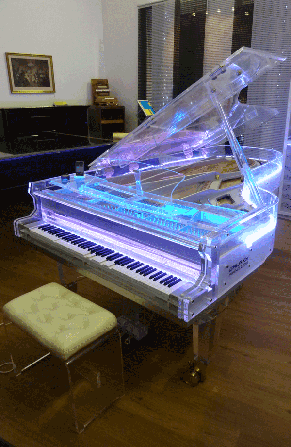 This is a Diamond acrylic concert grand piano with iQ PianoDisc player system and Bose sound system. This is a real „eye-/ear-catcher“ – and a true luxury item. It has been built by the Dubai-based Galaxy-Piano company – this instrument is called „the flagship instrument in our production line“ by the company. On their homepage it is described as:“…Its outstanding transparency and brilliant illumination enhances the size of 2760 mm length and a weight of 757 kg. Its impressive size is a suitable fit in large hotel lobbies, foyers and sizeable villas.“ The piano would also also bring happiness to any private home – however it is a concert grand piano, it can also play very softly. This iQ player system combined with the Bose sound system allows a fantastic musical repertoire (the entire spectrum of classic to modern, piano solo and piano combined with other instruments / singing) to be enjoyed without playing yourself. Nevertheless this concert grand piano also can be played as a concert piano – the touch and sound is really impressive. This piano has special flight cases for transport purposes.