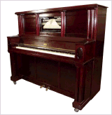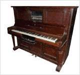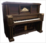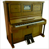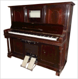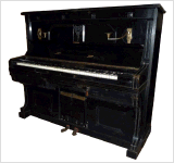 Ludwig Hupfeld had the right business instinct to invest intoJ. M. Grob in 1893. Short after this he introduced the Hupfelds Patent 429419 Elektrisches Piano using the Pressspan (cardboard) rolls. This could be integrated with any type of piano - played by hand with a crank - or with electric motor. As the Phonola introduction of paper rolls followed in 1902 already, theses cardboard roll playing pianos haven't been sold on a larger scale. Rare find today. This is one of these pianos in a wonderful playing (by hand, electric motor needs overhaul) condition. A beautiful artcase piano with electric lamps. This piano had been sold by the Munich Musikhaus J. B. Westermair located close to famous Viktualienmarkt. Last foto (source: IHK Nuernberg, Bayerisches Wirtschaftsarchiv BWA) in the gallery shows and advert of this company of the 1890's presenting such a Hupfeld piano.