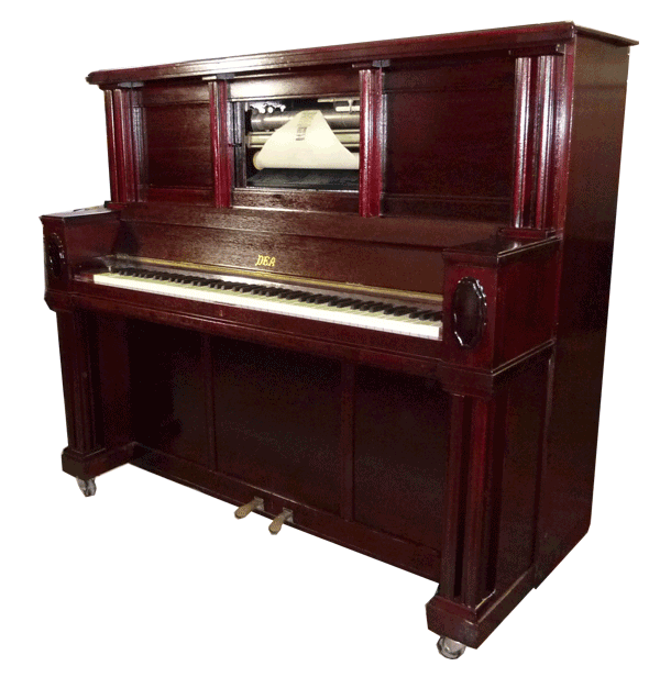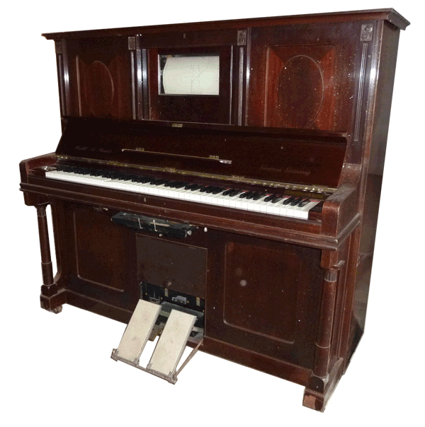 This Hupfeld DEA Rönisch piano was the first model advertised by Hupfeld after 1907. An imposing concert piano, built in noble mahogany for great rooms. This DEA piano was built approx. in 1913 and is visually very beautifully preserved. The self-playing system and the piano acoustics need to be completely restored. The extremely wide DEA rolls are rather rare - however, they can be provided as punched copies. Many great composers and pianists have effusively commented on the quality of the DEA instrument.