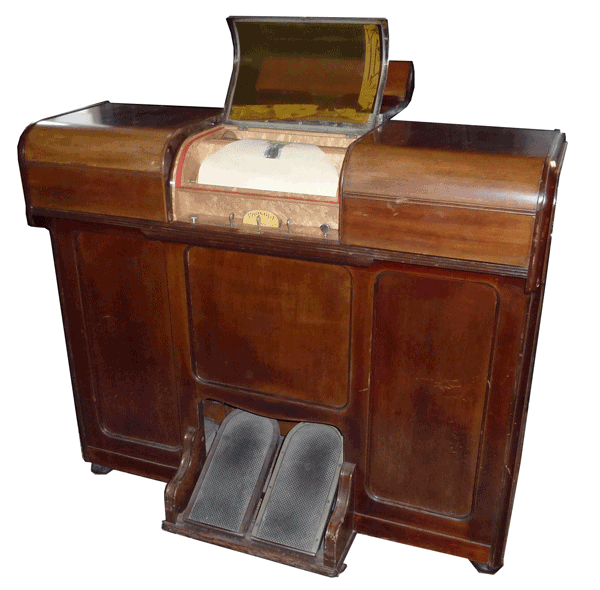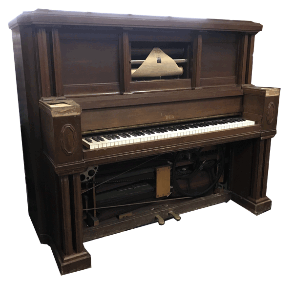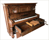 This Hupfeld Phonola push-up player is quite a special version. Hupfeld had popularly announced a combined push-up player with 72 note and 65 note scales to tighten up the competition with Aeolian that had gained a broad range of customers with the previous market launch of its 65 note scale pianola. Few push-up players of this version were actually sold. This is such a combined push-up player that can play Phonola rolls with the 72 note scale - and, in addition, rolls with the 65 note scale. The tracker bar has a slider for switching, and there are two hooks at the take-up reel. The push-up player is very well preserved and wonderfully applicable after a necessary refurbishing.