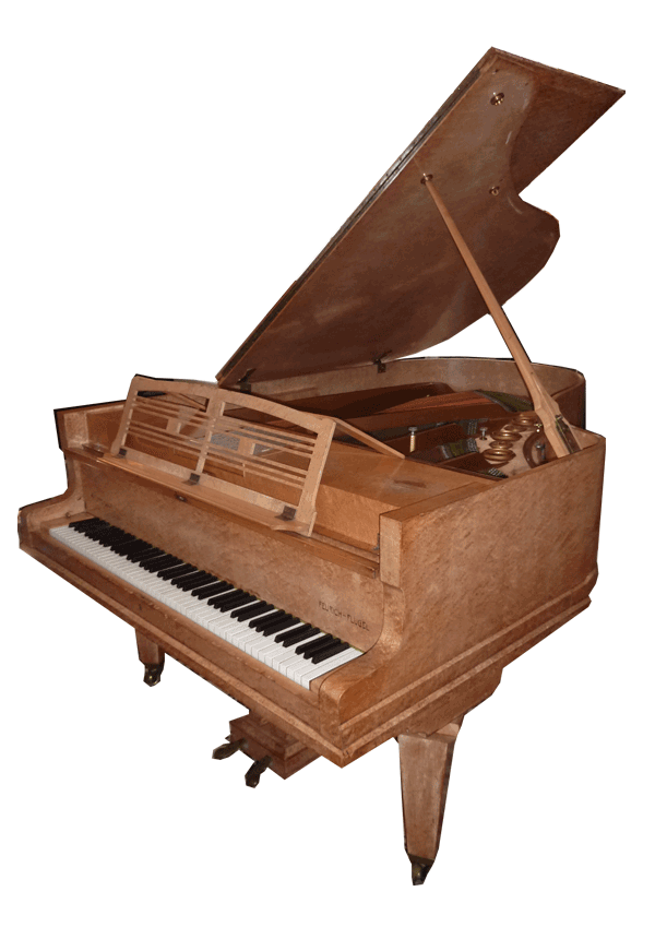This grand piano may be quite unique. According to its previous owner, it was specifically made for an American dancing couple, but could not be delivered due to the beginning of the war. A married couple from Germany bought it then - and it stayed with them, its first owners, until recently. The Feurich grand piano was very sophisticatedly made with a bird's eye maple cover. To our knowledge this is the only Feurich DUCA with this design, as it has been ordered with a special customer-defined design. It got delivered by Feurich on May8th, 1914 to Welte with a sales price of 1415Mark, which was a much higher price than average due to the valuable veneer. The Philipps Duca reproducing system is completely preserved. Even the original fan unit is preserved in entirety and in functional state - its artistic design is a document of its age. The grand piano is currently getting overhauled, so that it will be self-playing again soon.